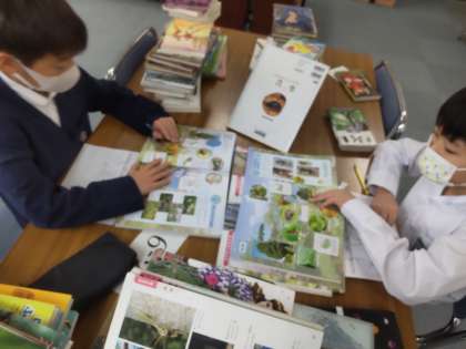 生き物の1年間のようすをまとめています。桜の成長やてんとう虫の成長などを、図鑑を使って調べました。