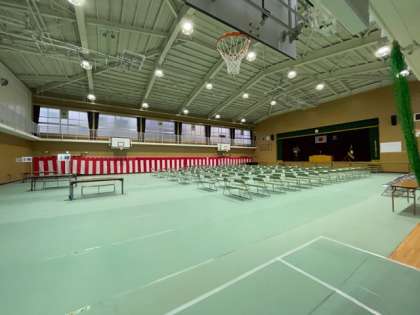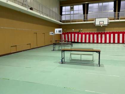 1 講堂入口近くに、クラス名簿を掲示しています。お子さまのクラスを確認後、本校の講堂内にて受付をします。