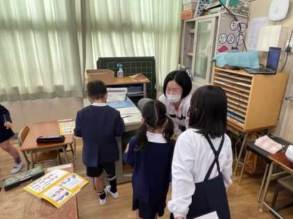 友だちとあいさつをし、自己紹介をしたら、カードにサインをしあいます。