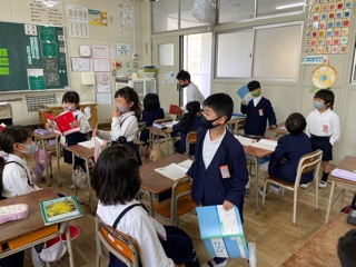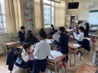友だちに自己紹介をし、しつもんしたり、やりとりしたりする学習です。