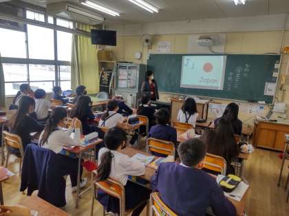 世界地図を見ながら、その国がどこにあるのか、また、国旗の確認をしました。