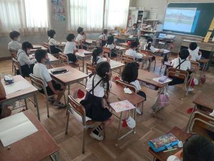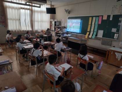 今日は雨のため、教室で速く走るためのコツについて、動画で確認しました。