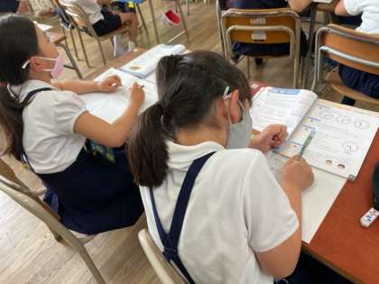 教科書の中の時計を使い、何時何分になるか答えることができました。