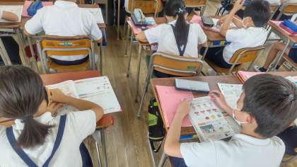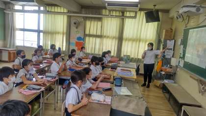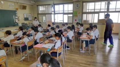 本校では、小中連携の取り組みとして、中学校の英語の先生に来ていただいて、外国語の授業をしていただいています。