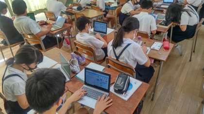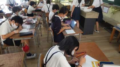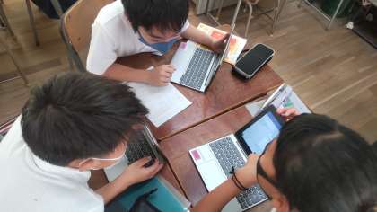 一人1台パソコンを使って地震や水害などについて、グループで調べました。