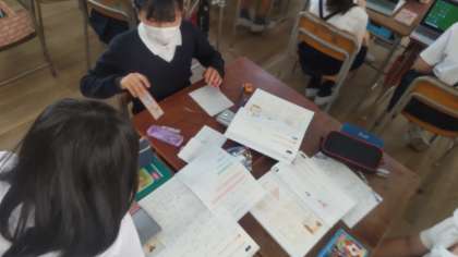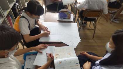 自分の書いた記事と友だちの書いた記事をどうつなげるか、相談しています。