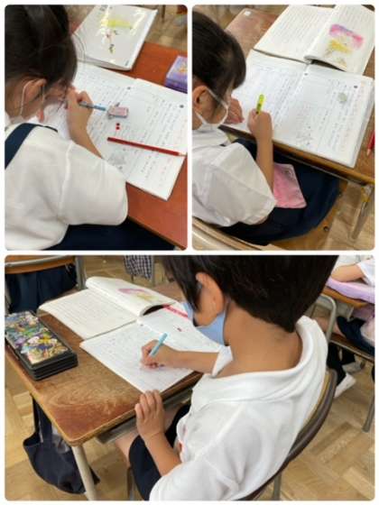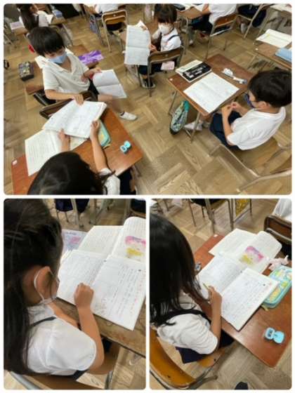 登場人物の気持ちをプリントに書き、班でノートを交換し、良い意見と思ったところには、シールをはります。