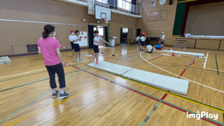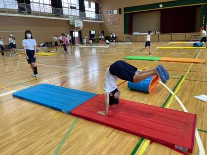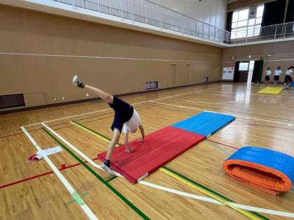 安全に気をつけて、ロンダートや倒立前転の練習をしました。