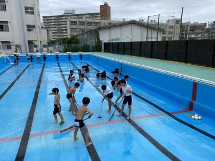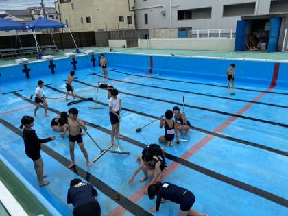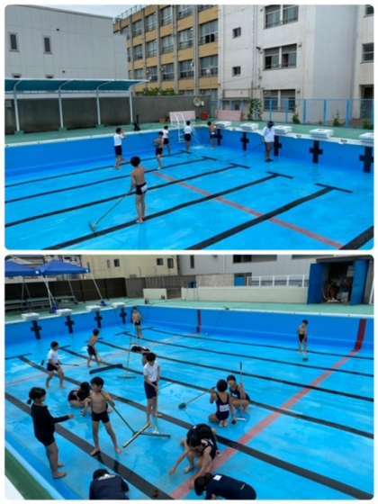 体育委員会の5、6年生の児童が、学校のみんなが気持ちよくプール水泳ができるようにと一生懸命掃除をしてくれました。