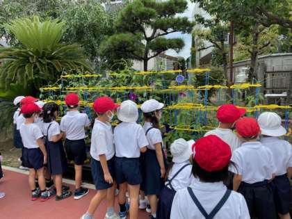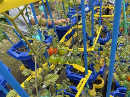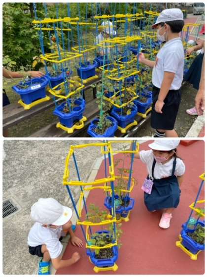 1年生、2年生はアサガオとミニトマトを教室の前に置いてあります。