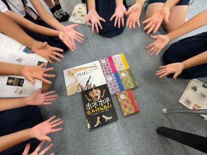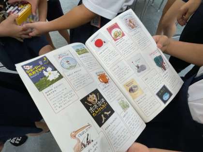 図書の時間に、国語の教科書に載っている作品を探しました。