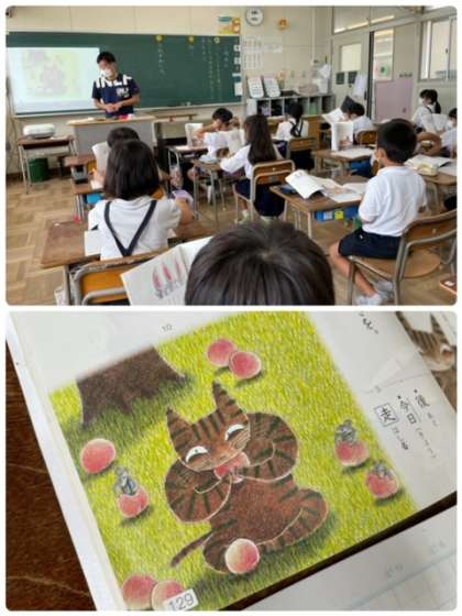 いっしょにももを食べているねこと子ねずみの気もちを考えました。