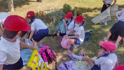 先生の注意を聞いたあと、手指消毒をして、お弁当とおやつを食べます。