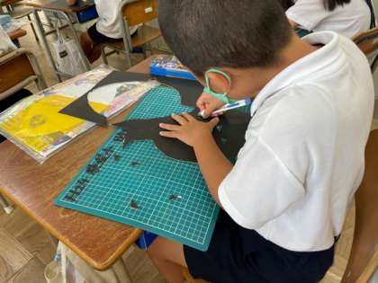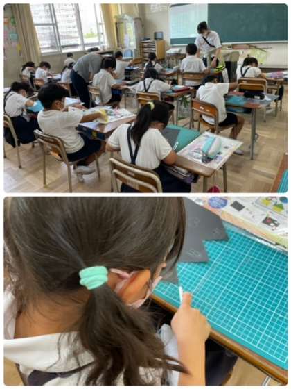 カッターの使い方に苦労しながらも黙々と手を進める2年生でした。