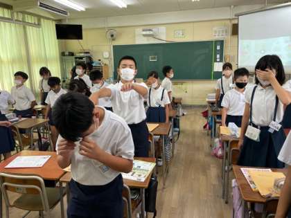 目を閉じたまま先生の言葉を聞いて、あっちこっちを向きます。