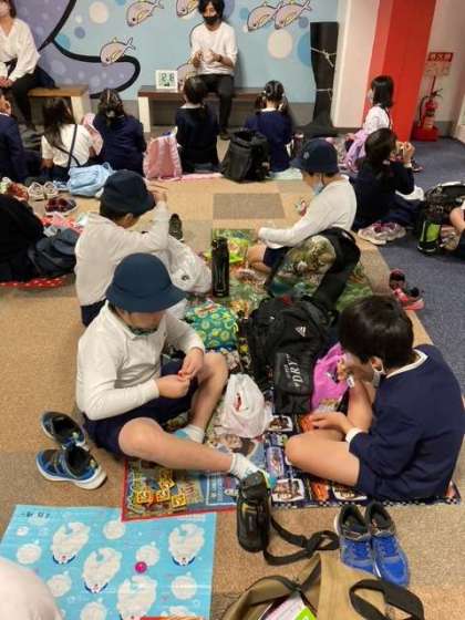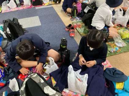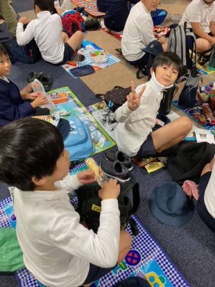 おやつタイムです。200円以内でみんなお気に入りのお菓子を買ってきました。お菓子の交換は禁止です。