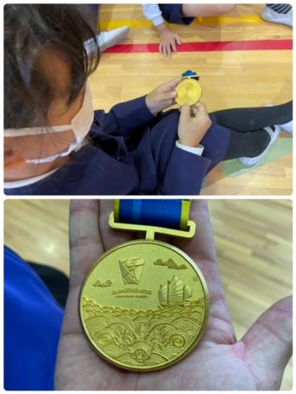 初瀬選手からは、目の見えない方にもメダルが金、銀、銅分かるように、音が出たら、へこみを入れたりと工夫してあることを聞かせていただきました。