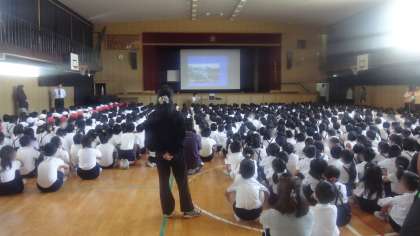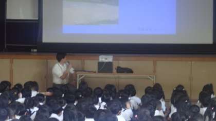 今日の児童朝会は、大阪市の環境局、仲秋さんに来ていただき、地球温暖化と省エネについてお話を聞きました。