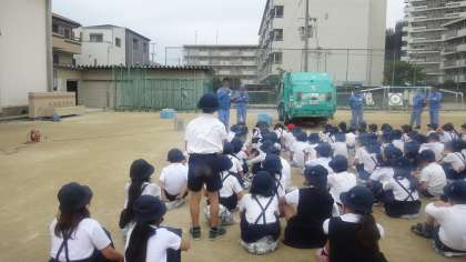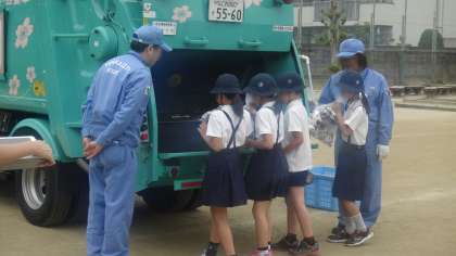いつもごみを集めに来てくれるパッカー車が小学校にやってきました。