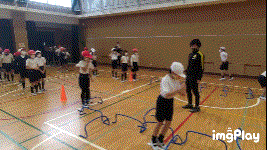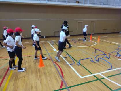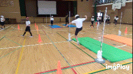 高跳びに取り組む前に「横堤メソッド」を取り入れた準備運動を行っています。