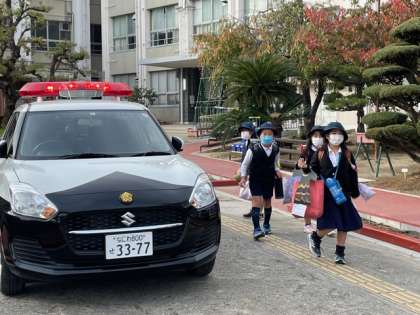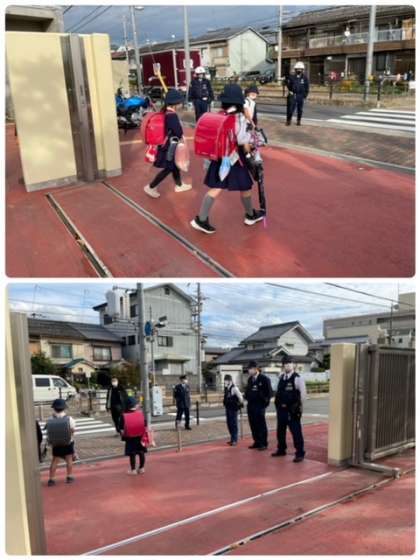 子どもたちが帰る下校の時間に、鶴見警察の方が来てくださいました。