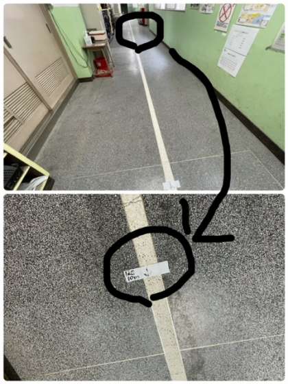 廊下に10メートルの印があります。