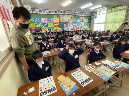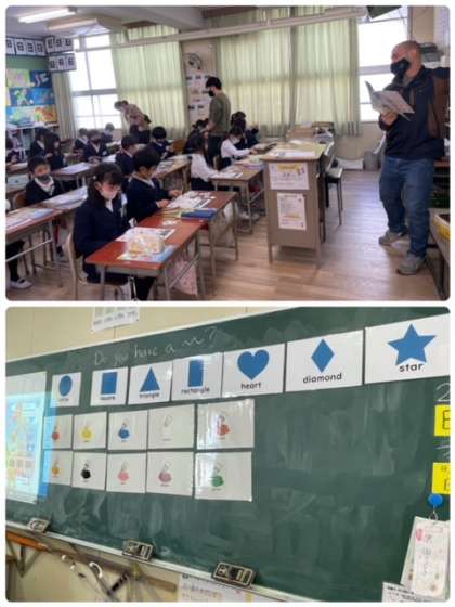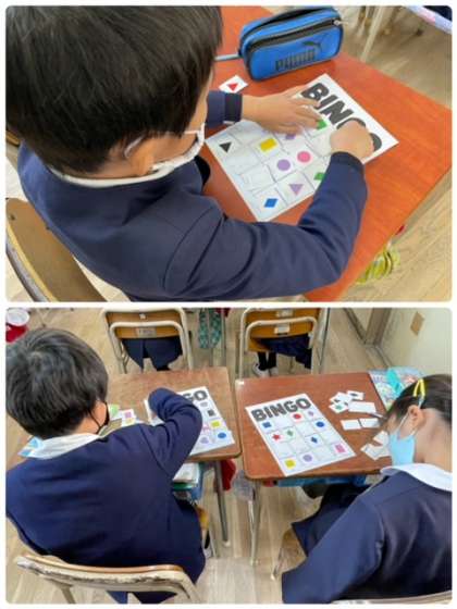 いろいろな色と形のカードを紙の上にならべ、ジョン先生が発表したものと同じであれば裏返します。
