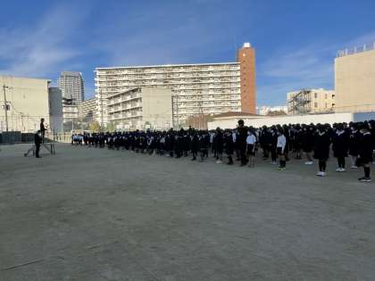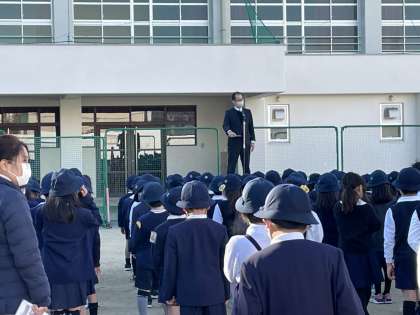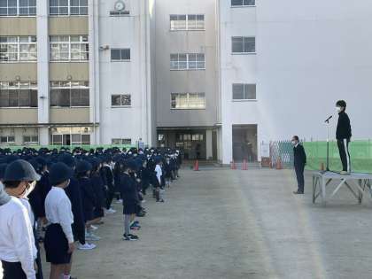 今日の全校朝会は、校長先生のお話のあと、担当の先生から12月の生活目標についてのお話がありました。