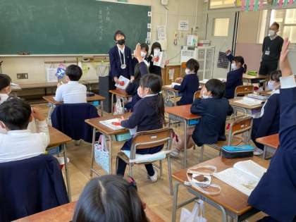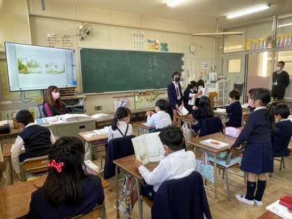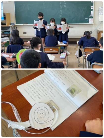 お面ならぬ登場人物メダルをかけ、役になりきって、発表することができました。