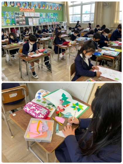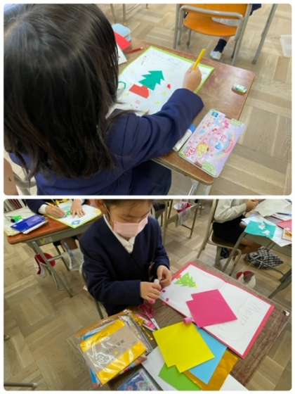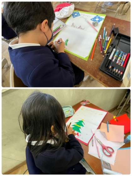 クリスマスカードの中のツリーにそれぞれ思い思いの飾りつけをしました。