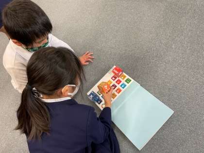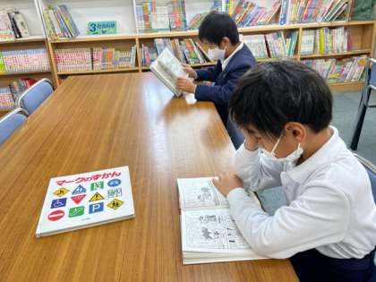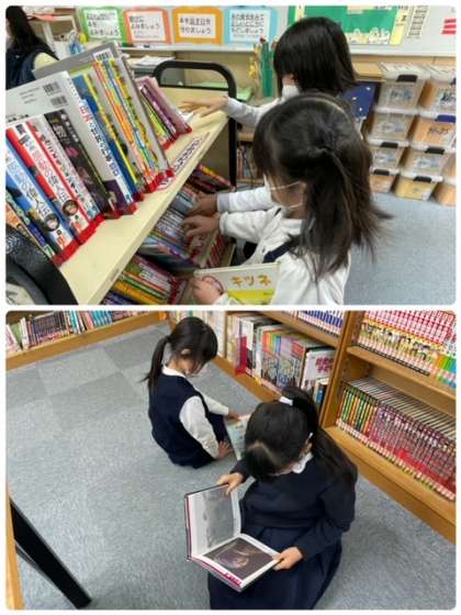 新しい本の前で何を読もうかと悩んでいるお友だちや、本棚の前で思わず立ち止まり本を読んでしまうお友だちなどなど図書室の時間を満喫しました。