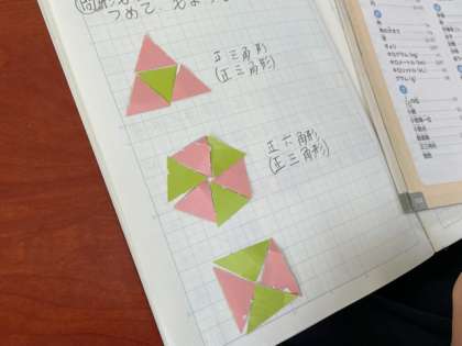 子どもたちは工夫して、正三角形や正方形などいろいろな形を作ることができ、前で発表することもできました。