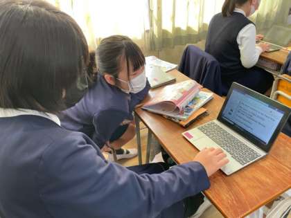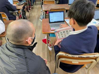 パソコンを使い、外国語の学習です。