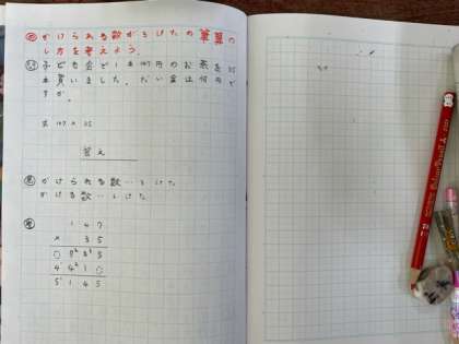 筆算をするときに、くり上がりの数を書いておくと計算間違いが少なくなることに気づくことができました。