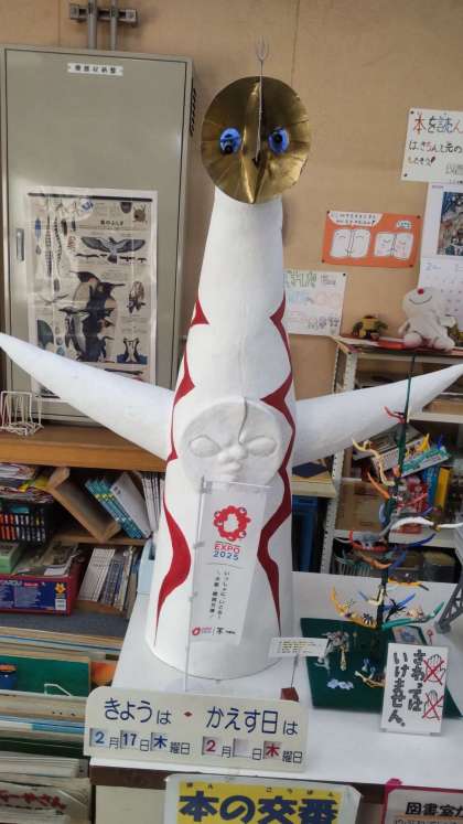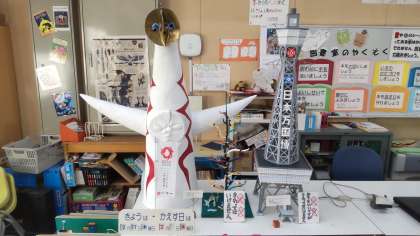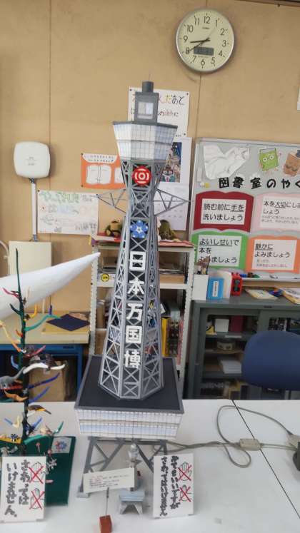 写真は、教頭先生のお話にもあるように、地域の方が「横堤の子どもたちが少しでも笑顔になるように」と、「太陽の塔」「通天閣」をお貸ししてくださいました。