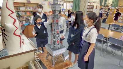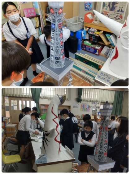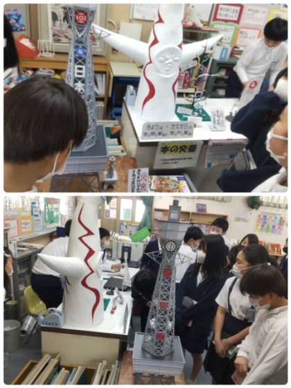 地域の方が作り、お貸しいただいた「太陽の塔」や「通天閣」を鑑賞しました。