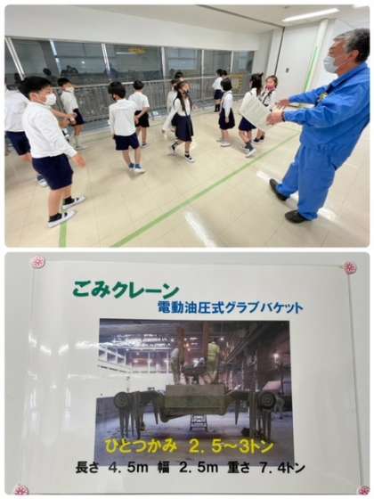 何と一回で3トンのごみをつかんでしまうこと、みんながいま立っている緑のテープの内側くらいまでの大きさがあること。