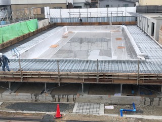プールサイドの床面が形作られました。小雨の中、作業員の方々が工事を進めてくださっています。