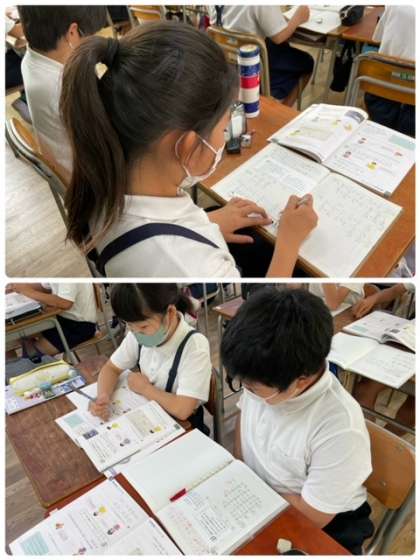 上の問題をどんなくふうをすれば早く計算できるのかおとなりのお友だちと話し合いをしています。