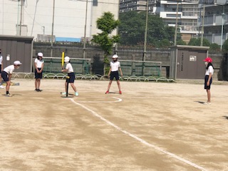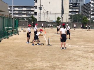 ティーボールの学習です。バットコントロールが難しいので、ボールがなかなか飛びません。