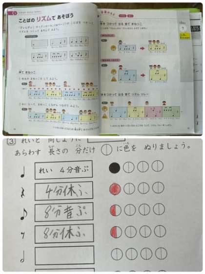 四分音符や四分休ふについて、プリントや図を通して学習しました。