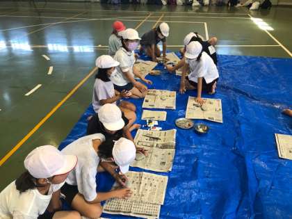 女子チームは、石ころアートに挑戦。思い思いに下書きの真っ最中です。