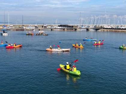 カヌーが出発。恐る恐る漕ぎ出していたのも束の間、パドルの入れ方のコツをつかみ、湾から出ていきました。
