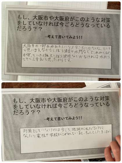 いろいろな対策を知った上で、もし対策をしていなければどうなっていたのかをみんなで考え、意見を交流しました。