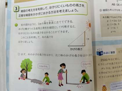 縮図の考え方を使い、高さの分からない「木」の高さを求めます。