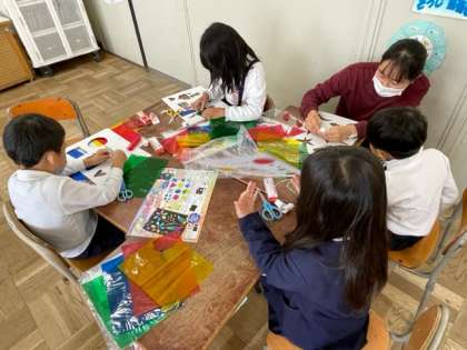 裏の白い側に、いろいろな色のセロハンを貼ります。