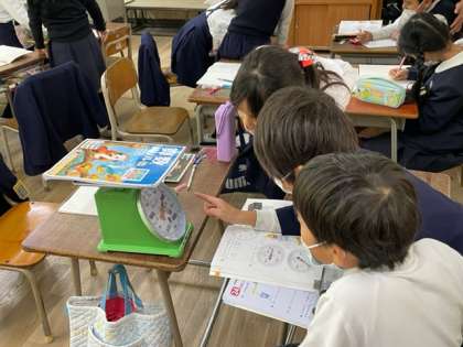 使い方を知った後、実際に、ドリルや教科書の重さをはかりました。