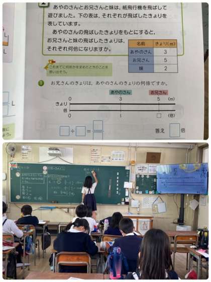 何倍になるか考えようというめあてで、あやのさんの飛ばした紙飛行機の距離をもとにお兄さんと妹の距離が何倍になっているかを調べました。