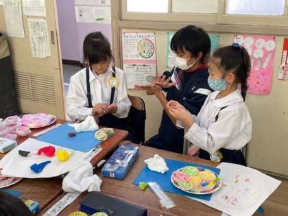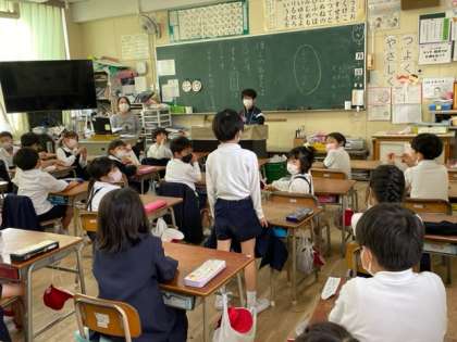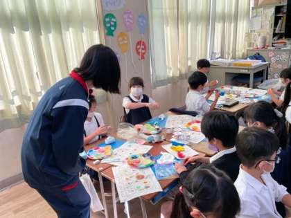 職場に来た中学生が1年生のみんなといっしょに楽しく活動しています。