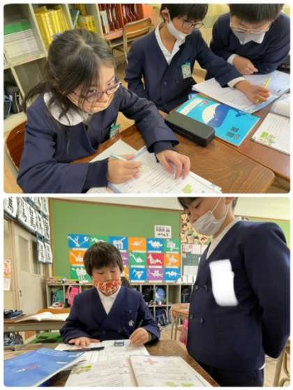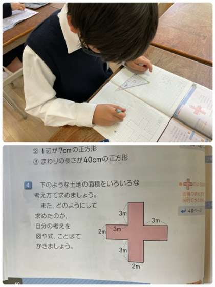 いままで学習したことを生かし、あの手この手で図形の面積を求める4年生。